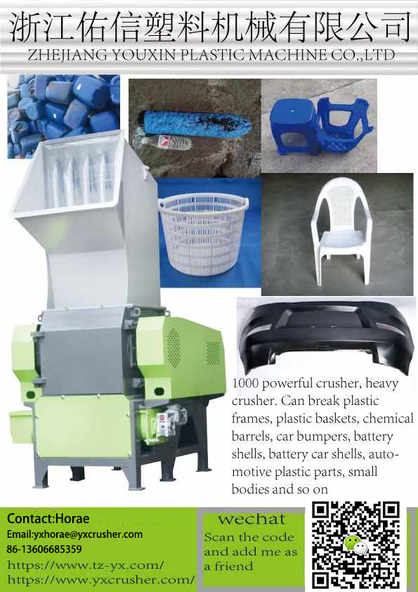 A Youxin Company műanyag zúzók széles skáláját kínálja. Vannak olyan standard műanyag zúzók, amelyek megfelelnek az általános műanyag zúzási igényeknek; műanyag pulverzók, amelyek a műanyagok finomabb részecskékre őrölhetők; és a nagy teljesítményű zúzók, amelyek alkalmasak a nagyobb kihívást jelentő műanyag anyagokra. Ezen felül kifejlesztettek speciális zúzókat olyan speciális tárgyakhoz, mint például gyümölcskosarak, dedikált zúzók a film típusú műanyagokhoz, és még a tonnás táskák nagy könnycseppgépeit is, amelyeket ömlesztett műanyag csomagolás kezelésére használnak.